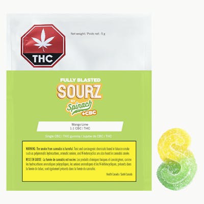 Prepare for blast off! SOURZ by Spinach® Fully Blasted Mango Lime 1:1 CBC | THC gummies feature a combination of tropical mango and tangy lime flavours. Enjoy a balanced blend of 10mg THC and 10mg CBC per piece. This dual-flavoured gummy is over-the-top with natural flavours and blasted with sour crystals. 1 gummy per pack, 10mg THC total and 10mg CBC total.