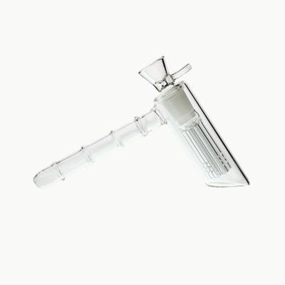 The Nice Glass L-Shaped 6-Arm Percolator Hand Pipe is a unique, standable hand pipe crafted from durable borosilicate glass. Featuring an angled base for stability on flat surfaces, this clear pipe includes a 6-arm percolator that enhances smoke diffusion, delivering smoother, cooler hits.