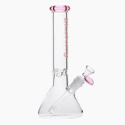 Borosilicate glass Tube diameter: 38mm Base diameter: 100mm This mini bong is equipped with ice pinches, a herb bowl and a slitted downstem. The beaker base is wide and sturdy with colour glass accenting the mouthpiece.