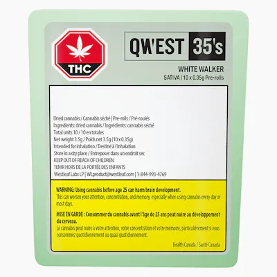 Walk this way — fast. White Walker (White Widow x Skywalker) leans spicy and pine-forward with a citrus hit. It'll have you running back for more. Say goodbye to overpriced mediocrity. Qwest 35’s 3.5g whole flower pre-rolls are crafted in small batches and hang-dried to keep their natural flavours and potency. Consistent craft quality without the sticker shock. The truth is in the bag.
