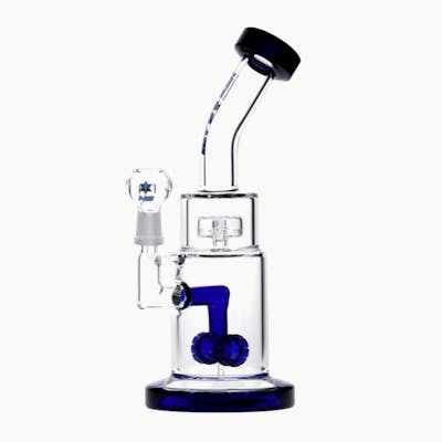 If you want a rig that looks like a piece of industrial machinery, this 9-inch Nice Glass setup features a double-chamber filtration system. It stacks a double wheel percolator under a horizontal-slit drum diffuser to ensure every hit is fully filtered through the water. Built on a sturdy 100mm base with colored glass accents, it comes ready to go with a classic dome and quartz nail setup.