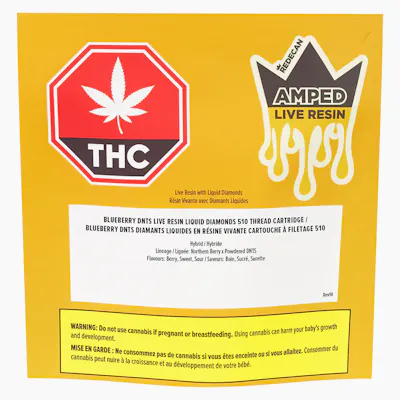 Redecan’s Amped Live Resin Blueberry DNTS 510 cart combines the full spectrum flavour and authenticity of live resin with the potency of high purity liquid diamonds. For a high intensity true-to-strain experience, we've boosted our live resin with liquid diamonds to deliver the full Blueberry DNTS experience, amped up. Expect rich berry, sweet, sour flavours, with no fillers or cutting agents. Featuring a medical grade TrueDraw Ceramic™ core, the wide body design is engineered for extracts, delivering smooth hits, enhanced airflow and clog-free draws.