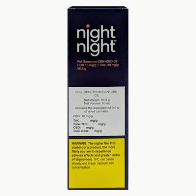 NightNight full spectrum CBN+CBD oil contains 10 mg/g of CBN, 30 mg/g of CBD and no THC. NightNight’s CBN+CBD formulation is combined with MCT and terpenes, resulting in a full spectrum oil. All NightNight's CBN products include CBD and other natural ingredients to create quality consumer-focused products. NightNight products are developed and manufactured by Purileaf in Niagara Falls, Ontario. Each lot is tested by accredited laboratory to ensure quality and consistency.