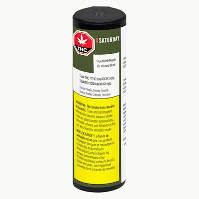 Rich, smooth and unmistakably Canadian, Saturday's True North Maple XL Infused Blunt delivers the sweet taste of maple syrup, a creamy touch of vanilla and a hint of dark coffee. Crafted with an indica dominant hybrid blend of whole cannabis flower, never shake or trim, and pre-infused for a smooth and consistent burn. Available in hemp paper blunts.