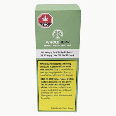 WholeHemp’s Full Spectrum CBD Oil is made locally in small batches by infusing the finest Ontario sungrown hemp flower in organic sunflower oil. Packaged in a 30ml amber glass bottle, WholeHemp CBD Oil contains 750mg of Total CBD per bottle (25mg/ml) with very low levels of THC (1mg/ml).