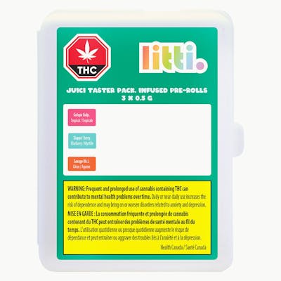 Explore LITTI.'s JUICI. Taster Pack. Each pre-roll is infused with THC and mouthwatering terpenes. You'll find a Slappn' Berry, a Gulupa Gulp and a Savage OH J, all bringing their unique and vibrant flavours. The Slappin' Berry rolls in with a wave of sweet and fruity flavours. Gulupa Gulp has passion fruit flavours. Savage OH J is a tangy orange juice sensation.