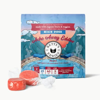 Our very cherry Ache Away Eddies are infused with a soothing blend of CBD, CBC & THC, plus a natural blend of turmeric, piperine, and vitamin E that may help ease inflammation and aid recovery.