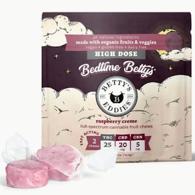 Tired of being tired? Betty's got your back. Our newly formulated Bedtime Betty's recipe infuses a dreamy blend of THC, CBN, and CBD into raspberry creme chews, which may aid in a night of deep sleep. Betty knows best, invest in good rest! -- Betty's Eddies™ handcrafted fruit chews are made with all-natural ingredients and a whole lotta love. We use organic fruits & veggies, full-spectrum cannabis, supporting cannabinoids, and herbal supplements & vitamins to help you feel your Betty best no matter what life throws at you. Life is better with Betty’s.