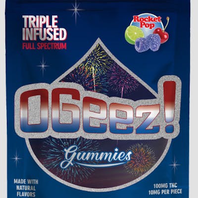 OGeez! Triple Infused - A triple-layered gummy like no other — bursting with flavor and fun! This visually stunning three-layer red, white & blue gummy is engineered for flavor, balance, and full-spectrum depth. Bursting with the sweet, tangy flavor of the classic Rocket Pop you know and love - now reinvented in true OGeez! fashion. Each layer is crafted with its own separate premium extract, giving this gummy one of-a-kind profile. RSO (Red Layer): Delivers whole-plant richness and robust cannabinoid expression, Distillate (White Layer): Ensures bright, smooth, and reliable onset , Rosin (Blue Layer): Provides solventless whole-plant depth for a balanced, full-spectrum finish Together, these layers create a multi-dimensional, full-spectrum experience you can taste and feel — from the first fruity bite to the balanced, well-rounded effects.