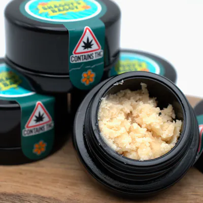 A 3.5 gram mini-baller jar of Nana's Pudding badder from our friends at Hybrid Farms! Hybrid. Banana Runtz x Feijoa. Aroma: Banana Candy, Creamy Vanilla. Effects: Balanced, Pain Relief, Functional.