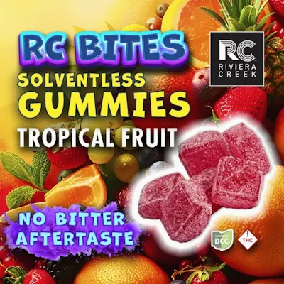 RC Bites Tropical Fruit Gummies — Island Vibes, Anytime Bright. Exotic. Seriously delicious. Transport your taste buds with RC Bites Tropical Fruit Gummies — a vibrant, juicy mix of tropical flavors that hits like a mini vacation. Smooth, flavorful, and solventless, these gummies let the fruit shine without any bitterness. Inside every RC Bite is Riviera Creek’s aeroponically grown cannabis, cultivated in a clean, controlled, pesticide-free environment that puts quality first. This creates a clean, consistent oil that elevates the tropical flavor to its fullest. • Bright, juicy tropical fruit blend • Made with pesticide-free cannabis grown through clean aeroponic cultivation • Solventless for smooth, clean, never-bitter taste • No chemicals. No shortcuts. • Always 100% Riviera Creek quality 10mg per gummy, 100mg per pack