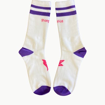 Step into all-day comfort with our Shangri-La Crew Socks, designed to combine function, style, and personality. These socks feature a clean white base with bold purple stripes at the cuff, adding a retro flair. The Shangri-La logo, printed in vibrant pink, makes a statement while staying subtle enough for daily wear. With reinforced purple toes and heels, these socks bring durability and comfort to your feet. Whether you're lounging, working, or hitting the gym, these breathable crew socks provide a snug fit while allowing flexibility and airflow. A must-have for any Shangri-La enthusiast looking to upgrade their sock game. Features: Design: White base with purple stripes and pink Shangri-La branding Material: Soft, breathable, and moisture-wicking fabric blend Durability: Reinforced heels and toes for long-lasting wear Fit: Crew length, designed to stay in place without slipping Style: Casual, sporty, and versatile for any activity Elevate your essentials—get your pair of Shangri-La Crew Socks today!