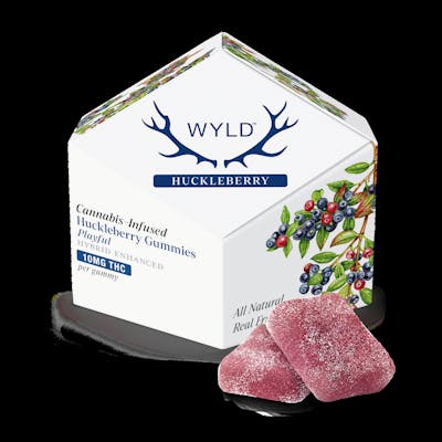 Also known as 'chuckleberry,' Wyld Huckleberry gummies are perfect for laughing the day away. Made with Hybrid enhanced terpenes and real fruit ingredients - every time. Balanced | Playful 100mg THC per package, 10mg THC per gummy. Ingredients: Sugar, Tapioca Syrup, Water, Huckleberry Juice Concentrate, Gelatin, Natural Flavoring, Coconut Oil, Pectin (Pectin, Sodium Citrate), Citric Acid, Malic Acid, Cannabis Extract, Sunflower Lecithin Contains: Coconut