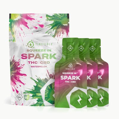 Tinctible is an infused squeeze gel, available in three effects and flavors for convenient, quick relief, wherever you need to squeeze in a little more. Spark - Watermelon: The perfect balance of THC and CBD for when you're feeling slumped. (10mg CBD, 10mg THC - 11 pouches per pack)