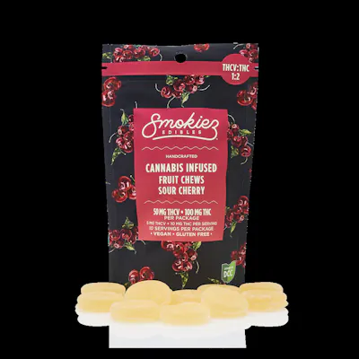 NEW! Smokiez™ Sour Cherry THCV:THC 1:2 Fruit Chews are NOT YOUR AVERAGE GUMMIES™ ;) These delicious fruit chews are a tasty and satisfying way for your customers to medicate! They are also Vegan, Gluten Free, Dairy-Free, and contain NO High Fructose Corn Syrup. Each of our mouth watering fruit chews contain 5mg of THCV, 10mg of THC. Made with our high clarity cannabis distillate for great taste! There are 10 pieces per package with a total of 50mg active THCV, 100mg of THC per package. 5mg THCV and 10mg THC per piece All natural Cherry flavoring. NO DYES OR COLORS!