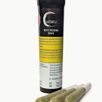 White Wedding is a unique and heavy hitter with earthy notes and coffee undertones. A vibrant, purple and green strain coated in a heavy layer of trichomes reminiscent of an early winter frost. Conveniently available in a pack of three 0.5 g pre-rolls.