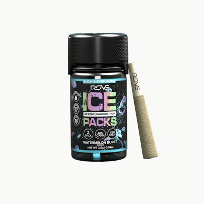THC: 622.9mg | b-Caryophyllene mg/g: 2.98mg | Linalool mg/g: 1.52mg | a-humulene mg/g: 1.50mg -- Rove Ice Packs prerolls, the world’s first triple-infused preroll. Made with premium-grade flower fully-infused with THCA diamonds and solventless ice hash rosin, expertly rolled and coated in more ice hash. Super smooth and ultra potent, Rove Ice Packs test up to 50% THC. Welcome to the next evolution of prerolls. WATERMELON BURST Get ready for the perfect balance of relaxation and energy with our Watermelon Burst. Our strain offers a juicy mix of sweet melon, head-rushing euphoria and a unique smoking experience. 3 pack - 0.5g each | 1.5g