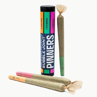 Bubble Joint Pinners are a "sessionable" version of The Flower Collective’s Bubble Joint. Three Pinners, each with a 10:1 flower-to-bubble hash mix. 1 Sativa, 1 Hybrid, and 1 Indica in each pack.