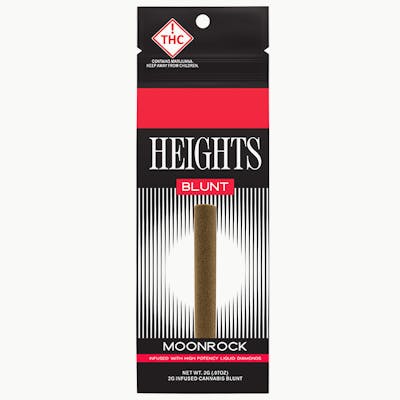 Heights Moonrock Infused Blunt is a heavy hitting preroll packed with cannabis flower and infused with potent liquid diamonds for an extra powerful smoking experience. Wrapped in a slow burning blunt wrap, it delivers bold flavor, thick smoke, and a long lasting session designed for consumers looking for a stronger infused option. STRAIN TYPE: Sativa-dominant.