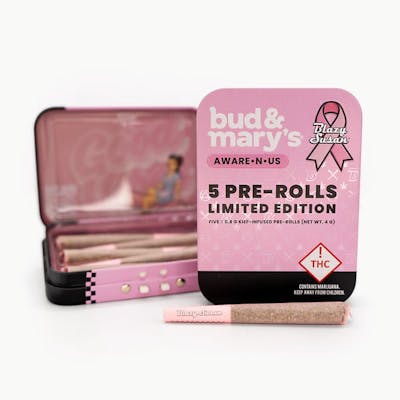 Light up something special with Bud & Mary’s kief-infused pre-rolls, wrapped in Blazy Susan’s signature pink papers. Each pack delivers 5 perfectly rolled, potency-tested joints made with premium flower with infused kief for an elevated, smooth burn. Choose from indica, hybrid, or sativa blends, each crafted to showcase distinct terpene profiles for a flavorful, reliable experience. With every purchase, you’re also supporting breast cancer patients through our Aware-N-Us partner Pink Fund. Premium cannabis, iconic papers, and a cause worth sparking. STRAIN TYPE: Indica-dominant.