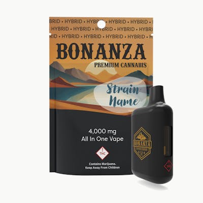 Bonanza All-In-One Vapes combine convenience and quality in a sleek, disposable design. Each device contains 4 grams of strain-specific cannabis extract, delivering smooth vapor, bold flavor, and consistent effects without the need for charging or refilling. Perfect for easy, on-the-go use, Bonanza AIO vapes are ready whenever you are. STRAIN TYPE: Balanced hybrid.
