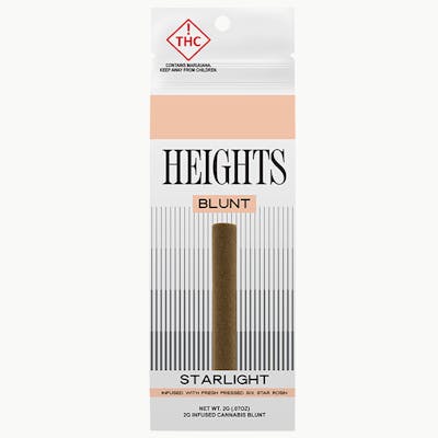 Heights Starlight Infused Blunt is a potent preroll crafted with high quality cannabis flower and infused with fresh press six star rosin. Wrapped in a slow burning blunt wrap, it delivers rich flavor, thick smoke, and a smooth but powerful session designed for consumers looking for a premium infused option. STRAIN TYPE: Sativa-dominant.