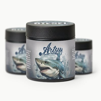 Artsy Craft Cannabis provides a uniquely memorable experience to its customers. Artsy works with top-notch cultivators & artists to develop premium flower and one of a kind packaging. Artsy cannabis is soil grown and hand manicured because we believe that quality product should burn clean, look great, and taste amazing. All of our plants are fed a nutrient line developed in-house and perfected by decades of experience. DESCRIPTION: Sharks in the water! Biesel is a rare Sativa-dominant cross with a strong lineage that includes Great White Shark, Haze, Sour Diesel, and many other original classics. This bud has a skunky sour flavor with a sharp hint of savory diesel upon exhale. The aroma is of fresh herbs and spices with a heavy, pungent overtone that turns to dank diesel as the nugs are burned. Biesel buds have spade-shaped, minty green nugs with lots of dark orange hairs and a coating of thick frosty, clear crystal trichomes. An excellent choice to chill out and be inspired at the same time. LINEAGE: Shark Haze x Sour Diesel. STRAIN TYPE: Sativa-dominant.