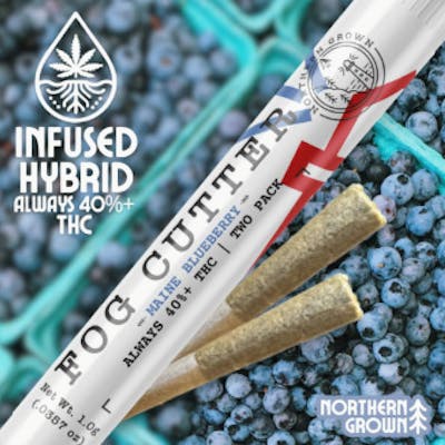 A match made in Vacationland... a quintessential flavor of New England... Experience the freshness of Wild Maine Blueberries elevated with Live Blue Dream terps in a sharable 2-pack of high quality pre-rolls. These Fog Cutters hit with a tart and juicy blueberry kick with just a touch of warm sweetness to keep the flavor grounded while you get lifted. Fog Cutters Infused Pre-Rolls are terpene-enhanced joints combining premium flower with potent THC distillate and added natural and strain-specific terpenes for bold flavor and elevated effects. Each 0.5 g preroll is crafted for a smooth burn and consistent draw, delivering layered taste and stronger, richer smoking experience than a standard joint.