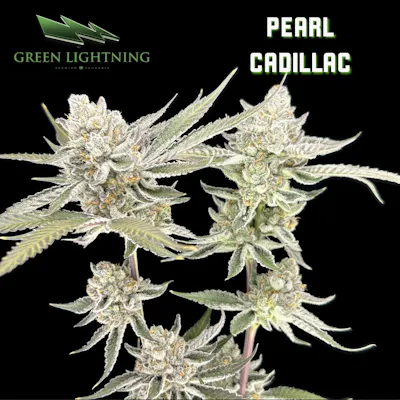 Pearl Cadillac from Green Lightning is an indica‑leaning flower celebrated for its luxurious, dessert‑style profile and smooth, feel‑good effects. The aroma “glides in” with silky notes of creamy vanilla, sugared berries and sweet grape candy, wrapped in soft floral earth and a faint hint of gas for depth. Its flavor follows the nose closely: rich and smooth like fruity cream, with touches of marshmallow, grape soda and gentle herbal elegance on the exhale, making each pull taste decadent and polished. Buds from Pearl Cadillac are typically well‑structured and resinous, often sold as both standard eighths and “small buds,” but still carrying strong visual appeal and stickiness. The high is described as refined and balanced, starting with a gentle mental lift and warm, dreamy euphoria that brightens mood and softens stress. Soon after, a soothing full‑body relaxation rolls in “like leather seats reclining after a long drive,” blending chill creativity, physical comfort and an easy, plush calm without instant knock‑out sedation—unless you keep going.