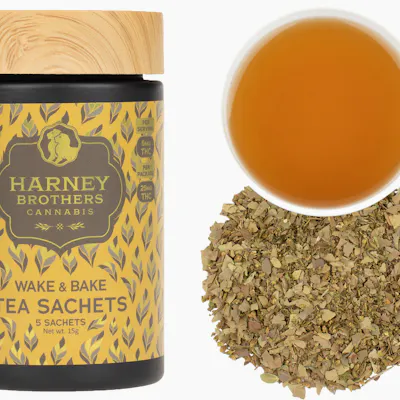 Harney Brothers Wake & Bake tea sachets are a cannabis-infused beverage featuring a caffeinated sativa-dominant blend of yaupon, guayusa, and yerba mate. While many retailers stock a 10mg THC per sachet (50mg total) version, a 5mg THC per sachet (25mg total) 5-pack variant is specifically formulated for a lighter, more balanced "buzz" and mental clarity