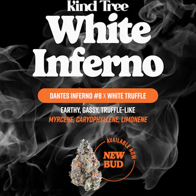 White Inferno from Kind Tree is typically described as an indica-leaning hybrid that balances a clearheaded lift with deep physical relaxation. Bred from Dante’s Inferno #8 and White Truffle. The flavor profile blends sweet, creamy notes with earthy depth and a bright citrus edge, often accented by fuel-like, truffle-forward funk. Aromas can lean toward citrus, herbal and hoppy tones with underlying gas, reflecting terpenes like caryophyllene, myrcene, and humulene that contribute to both spice and body relaxation. Visually, White Inferno is known for dense, resin-soaked buds that appear almost white from heavy trichome coverage, with lime to forest-green hues, occasional purple flecks, and vivid orange pistils. Many users report an initial euphoric, uplifting onset that supports creativity and mood, gradually settling into a calm, body-centered state well suited for evening unwinding or focused downtime.