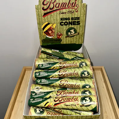 ALL PRICES INCLUDE TAX • Organic • 100% Unbleached • 100% Chlorine-Free • 100% Natural Tree Gum • 100% Bambú Quality Since 1764 • 3 Slow burning cones per pack Bambú Organic Hemp King Size Cones. For legal Non-Tobacco Use Only.