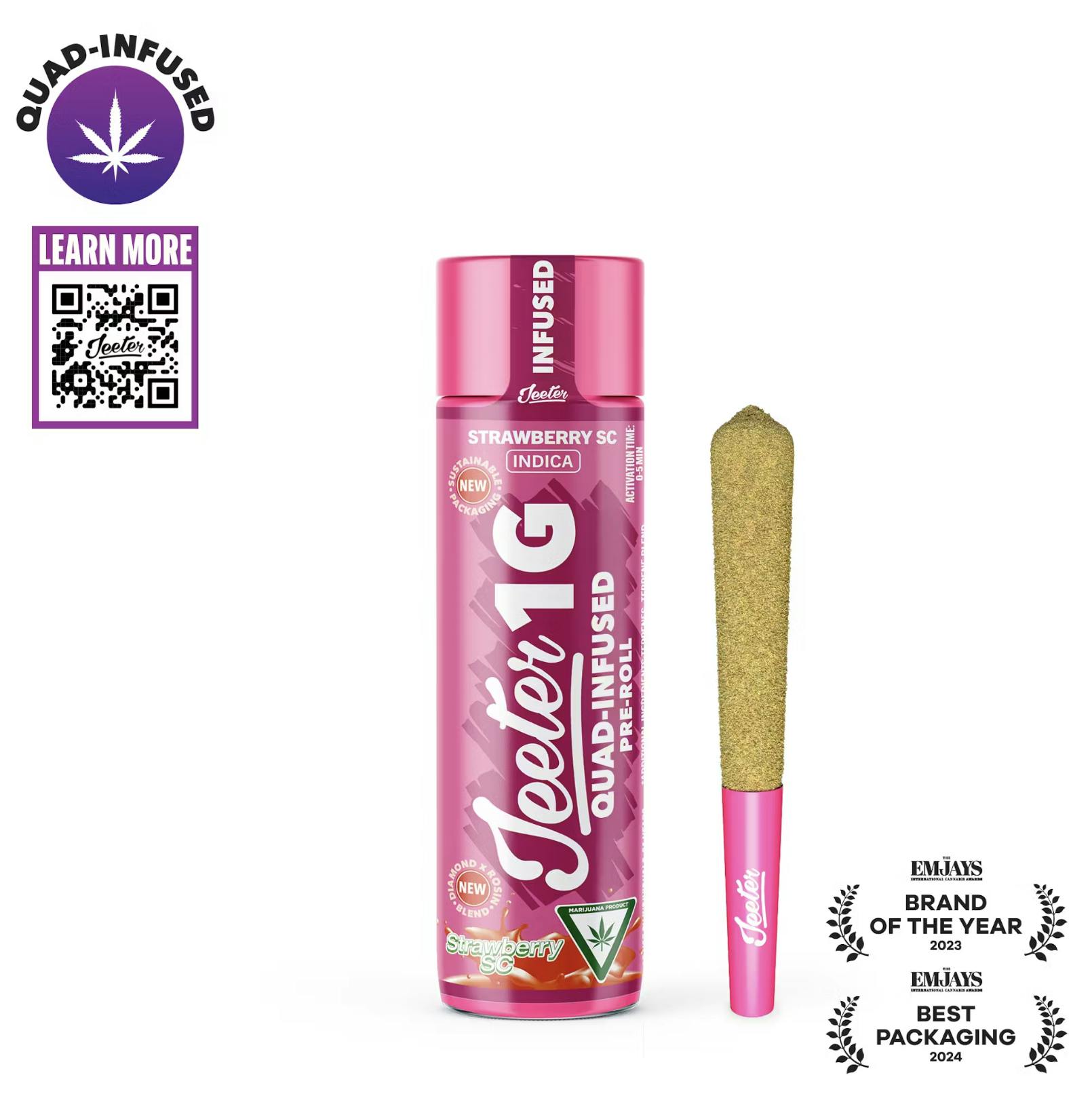 Strawberry SC - IndicaA head turning indica strain, Strawberry Shortcake crosses White Wookie with The White, offering a strong and super sweet strawberry flavor and aroma. This strain will put you down for the count in euphoric bliss, making any old couch feel like a slice of heaven.Jeeter’s Quad Infused Prerolls combine four layers working in sync for a maxed out infused experience. THCA diamonds add potency, rosin brings smooth, full spectrum depth, expertly crafted terpene profiles help shape the entourage effect while enhancing aroma, and a kief finish adds strength with a hand crafted touch. The result is a harder hitting experience with richer flavor that lasts longer.* Infused w/ liquid diamonds and rosin, dusted in kief* 2g XL Quad-Infused Joint w/ glass tip