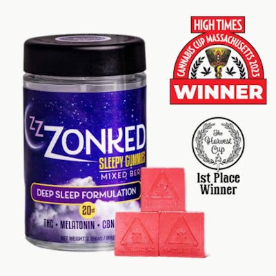 Sleep like a log tonight with Zzzonked Edibles, the all-new super sedating collection of gummies. Made with a natural blend of melatonin and full-spectrum cannabinoids: CBN, CBD, and THC, it's the perfect recipe for a good night's sleep. Zzzonked can help you fall asleep faster, deeper and regulate your sleep cycle for a more replenishing rest. Eat one piece an hour before going to bed, and relax. Onset effects may take up to one hour to begin; effects may include calmness, drowsiness, and sedation. Allergens: Contains Tree Nuts Ingredients: Corn Syrup, Sucrose, Water, Gelatin, Dextrose, Sorbitol, Citric Acid, Mixed Berry Flavoring, Cannabis Extract Oil, MCT Oil, Purple Food Coloring, Potassium Sorbate, Melatonin, CBD Isolate, CBN Isolate
