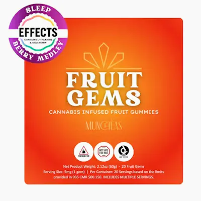 Munchèas hand-crafted Fruit Gems Effects were created to deliver targeted cannabis experiences with precision and care. The Sleep Berry Medley Gems feature a soothing blend of rich, juicy berries paired with 5mg of Liquid Gold premium cannabis oil and melatonin to support mind and body relaxation. Crafted to help ease you into restful sleep, these gems offer a vibrant burst of berry flavor with a smooth, mellow finish. Munchèas Effects Fruit Gems are thoughtfully formulated to enhance your wellness routine. Experience the art of relaxation in every bite. These products are not intended to diagnose, treat, cure, or prevent any disease. Effects may vary by individual. Descriptions are for flavor alone, and do not guarantee, suggest, or imply any health outcome.