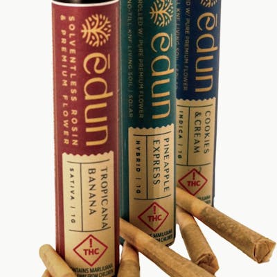 EDUN INFUSED ROSIN ROLLS give you the best of both worlds: the finest flower hand-selected from our zero-waste super natural garden with no shake or trim, and terpene-rich cold cure live rosin hash. Our infused pre-rolls can elevate the experience of even the most seasoned cannabis consumer.