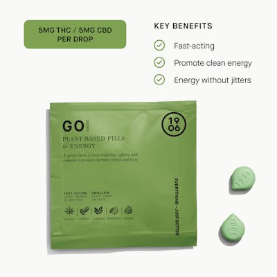 Drops for Energy. A powerful blend of cannabis, caffeine, and three plant medicines to promote energy. Each Go Drop contains 5mg THC and 5mg CBD. Fast-acting swallowable pills. Gluten free, dairy free, sugar free. - 1 Plant based pill - 5mg THC/ 5mg CBD - Promotes energy and stamina - Contains caffeine