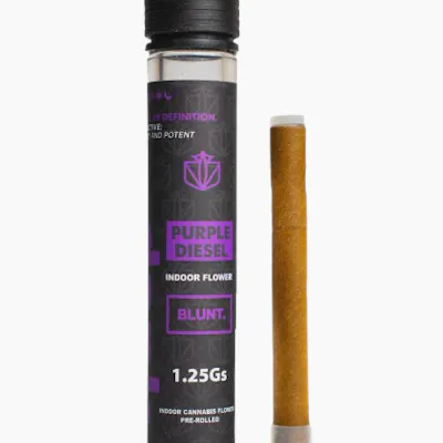 A 1.25 gram pre-roll blunt of premium DANK Purple Diesel Flower rolled in a fresh hemp wrap with a glass tip. Purple Diesel is a Cali Connection creation, bred from a Pre-98 Bubba female pollinated by an Original Sour Diesel male. This colorful hybrid features purple, olive, and orange-hued buds that refract light with plentiful trichomes. Flavors: Berry Blue Cheese Earthy