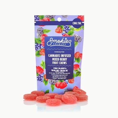 Smokiez Mixed Berry CBN:THC 1:1 Fruit Chews are NOT YOUR AVERAGE FRUIT CHEWS™ ;) These delicious fruit chews are a tasty and discreet way for you to medicate! They are also Vegan, Gluten Free, Dairy-Free, and contain NO High Fructose Corn Syrup. Each of our mouth-watering fruit chews contains 10 mg of CBN and 10 mg of THC, and made with our high-clarity cannabis distillate for great taste. There is 10 pieces per package with 100mg CBN + 100 mg active THC per package.