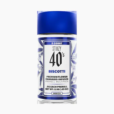Elevate your pre-roll game. STIIIZY 40's pre-rolls are setting the standard with high potency, cannabis infused joints coated evenly with kief. Using our proprietary live resin infusion methods, we’ve designed every pre-roll to offer 40% cannabinoids (THC) potency with a unique flavor profile. With a smooth inhale and tasteful exhale, each and every STIIIZY 40's is packed with premium, high quality flower specifically made to ensure a potent and long-lasting high. Spark up the 40'.