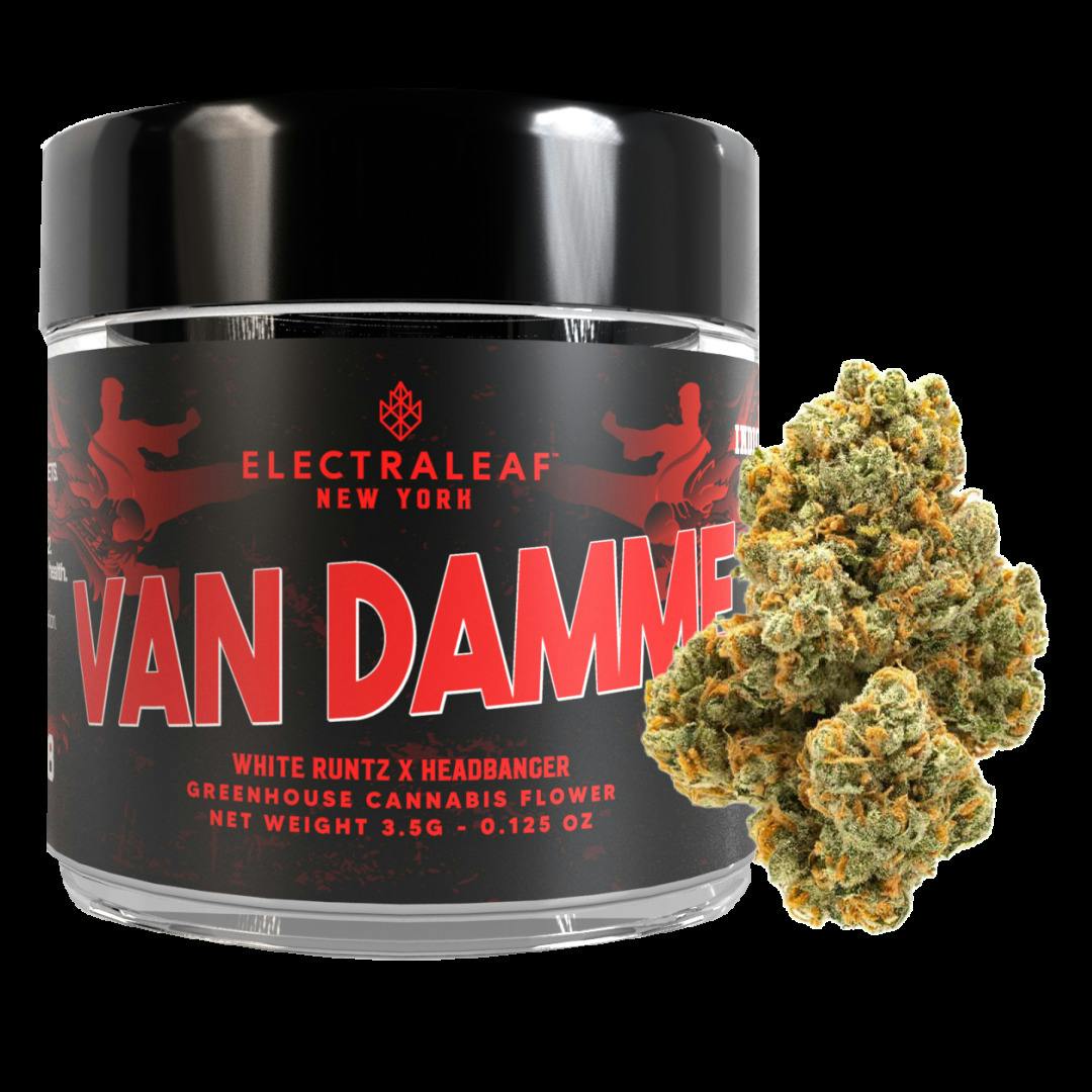 Van Damme is a striking indica-leaning hybrid born from White Runtz × Headbanger, delivering a profile that’s bold, flavorful, and confidently balanced. This strain blends creamy sweetness with gassy intensity, creating a layered experience that feels both smooth and powerful. It carries that unmistakable “premium jar appeal” energy expressive, aromatic, and built for those who appreciate flavor with presence. The aroma opens with sweet candy cream notes from the White Runtz lineage, quickly followed by sharp diesel and citrus brightness from Headbanger. Crack the bud open and deeper layers come forward subtle fruit sweetness, earthy funk, and a slightly spicy fuel undertone. Flavor follows that same arc: creamy and slightly sugary on the inhale, transitioning into citrus gas mid-palate, and finishing smooth with a lingering earthy sweetness.