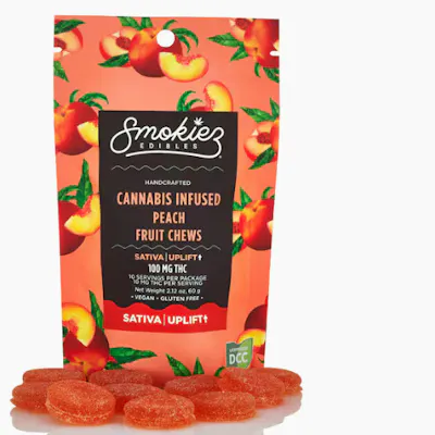 Smokiez Terpene-Enhanced Sativa Peach Fruit Chews are NOT YOUR AVERAGE GUMMY™ These delicious Fruit Chews are a tasty and satisfying way for your customers to medicate! They are also Vegan, Gluten-Free, Dairy-Free, and contain NO High Fructose Corn Syrup. Each of our mouth-watering Fruit Chews contains 10 mg of THC, and are made with our high clarity cannabis distillate for great taste.There are 10 pieces per package with 100 mg active THC per package. Smokiez Fruit Chews come in 5 delicious flavors and have both sweet and sour flavor profiles that your customers are sure to love! Because edibles are digested and absorbed by your stomach and liver, the activation is often longer than other consumption methods, taking on average 45 minutes, and sometimes up to 2 hours. It is important to start low and slow when consuming edibles so you don't over do it. Take extra caution to ensure edibles are out of the reach of children.