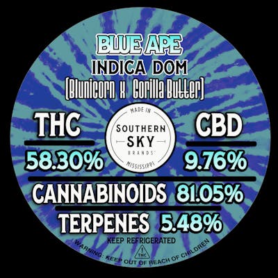"This product is Live Rosin. We harvested and froze our in-house, indoor-grown flower. We washed that flower in ice water and dried the resulting Bubble Hash in a pharmaceutical-grade freeze dryer. The only time this Bubble Hash was ever exposed to room temperatures was when we loaded it into a micron bag and pressed it between two hot plates. We collected the extruded product - Rosin - and loaded it into jars. This is a solventless product made without chemicals - only water, ice, heat, and pressure. We are excited and proud to bring a high-quality Live Rosin product to Mississippi medical patients." - Charles Thompson, Lab Director for Southern Sky Brand