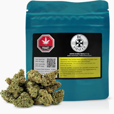 Ripped Bubba, is an Indica-dominant strain merging the genetics of Pre-98 Bubba Kush and Jack the Ripper. The buds are dense with lime and dark green hues, highlighted by amber pistils and a thick coating of frosty trichomes. The aroma is a complex blend of passionfruit, sweetness, spice, and skunk, which carries through into the flavour. This offering stands out for its distinctive combination of aroma, flavour, and visual appeal.