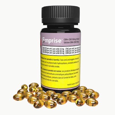 CBN+ CBD 50mg Softgels is a CBN and CBD-dominant formulation. Each softgel delivers 10mg CBN and 50mg CBD. Made with concentrated CBN and CBD distillate with coconut-derived MCT oil. Each bottle contains 30 softgels (300mg total CBN and 1500mg total CBD).