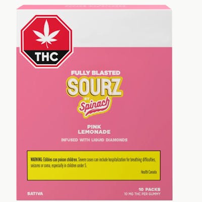 SOURZ by Spinach® Fully Blasted Pink Lemonade gummies have 10mg of THC per piece and the flavours of raspberry and lemonade! These dual-flavoured gummies are over-the-top with natural flavours and blasted with sour crystals. Enjoy 10 gummies with 10mg of THC per gummy and 100mg of THC per pack.