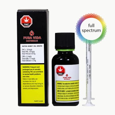 Pura Vida’s DAYBREAK Honey Oil drops are carefully extracted from hand-selected sativa-dominant flower (Kali Mist) and combined in pure organic MCT Oil. The proprietary extraction process allows a full plant profile, preserving the plant’s distinctive sweet earthy notes and subtle berry flavours without the need for back-added terpenes. This oil contains approximately 25.5-34mg/g of THC.