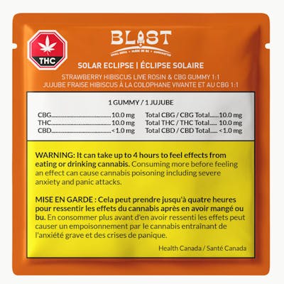 Bask in the radiant glow of BLAST Solar Eclipse Live Rosin CBG:THC 1:1. A perfect solventless full-spectrum gummy that pairs THC and CBG in balanced harmony. Enjoy a bright strawberry hibiscus flavour that shines as brilliantly as the sun itself. Each bite surrounds you with warmth and sweetness.