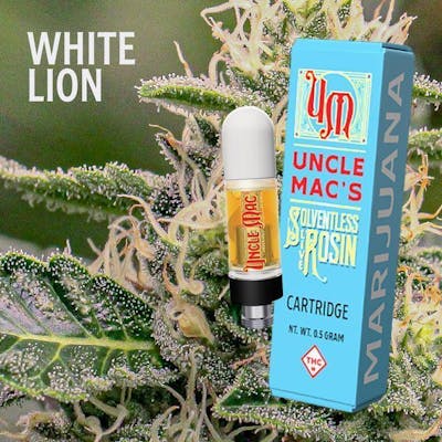 Uncle Mac's - Live Rosin Cart - 0.5g - White Lion Hybrid White Down x Green Apple Gas, White Lion has a piney, floral aroma that hints at clarity and strength with a clean, euphoric lift. Effects: Sleepy, Hungry Terpenes: Caryophyllene, Myrcene, Limonene