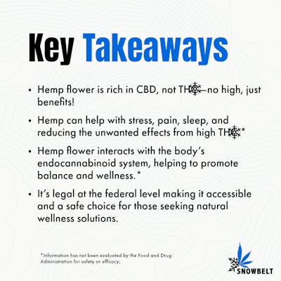 CBD Flower Our customers find a wide variety of benefits from using our hemp flower whether they use it on its own or mix it with their THC flower for a more balanced high. All of our hemp is grown in small batches in organic soil under LED lights and hand trimmed for the best possible quality. Top 5 Takeaways: Hemp flower is non-psychoactive and contains less than 0.3% THC, making it different from marijuana. CBD is the key compound in hemp flower, offering benefits like relaxation, pain relief, and improved sleep. Hemp flower interacts with the body’s endocannabinoid system, helping to promote balance and wellness. There are multiple ways to use hemp flower, from smoking to infusions and topical applications. Hemp is legal at the federal level, making it accessible and a safe choice for those seeking natural wellness solutions.